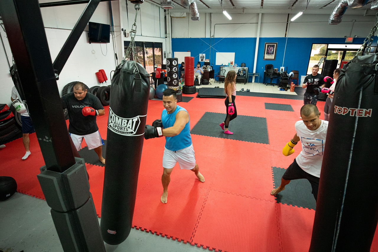 Josh Quiros (left) spars with friend Charles Cagle at a mixed martial arts gym in Tampa, Florida.